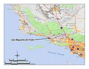 The San Miguelito Oil Field is a large and currently productive oil field in the hills northwest of the city of Ventura in southern California in the United States. The field is close to the coastline, with U.S. Highway 101 running past at the base of the hills and is sandwiched between the larger Ventura Oil Field to the east and the Rincon Oil Field, which is partially offshore, to the north and northwest. Discovered in 1931, and with about 7 million barrels of oil remaining out of its original 125 million, it ranks 44th in the state by size, and at the beginning of 2009 had 61 producing oil wells, all operated by Vintage Production California LLC, a subsidiary of Occidental Petroleum.[1]