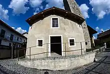 A structure at the site is documented by the 10th century. In the 12th century, the church was linked to Augustinian eremitic monks, with an adjacent monastery. The spare-appearing church has a single nave and ends in a semicircular apse.[1] The tall 10th-century bell-tower, which doubled as watch-tower, is a Romanesque structure with mullioned windows.[2]