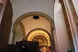 The inside of the church is in the form of a cross, with thick interior buttresses that marked off space for the church's various chapels.[3] These buttresses extend upwards to support a handkerchief-vaulted ceiling. These interior arches have been painted with rustic-style flora and fauna created by Roberto Montenegro, Jorge Enciso, Gabriel Fernández Ledesma, and Rafael Reyes Espindola.[2][5]