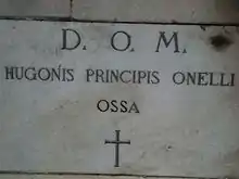 Lord Tyrone himself died in 1616 and was buried in the church with much less solemnity. The original simple tombstone was lost in about 1849, but the text of the short inscription was copied: "D.O.M. Hugonis principis ONelli ossa" (Dedicated to God the Best and Greatest. The bones of Prince Hugh O'Neill). In 1989, Tomás Cardinal Ó Fiaich laid a new marble plaque with the same inscription in approximately the original place.[5]