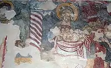 In the only chapel on the right are frescoes by a local artist whose signature is Bonamico P. dating from 1225 and rediscovered in 1910.[2] Depicted are theories of the Apostles, prophets and numerous saints, especially female saints, as it was a female monastery. Among the saints appears Prosper with crosier and mitre surrounded by devotees frightened by Archangel Michael, sent to judge souls. Pietro Diletti, Salesian historian of art, reads the painting as a representation of the Last Judgment,[3] more specifically the quotation from the Gospel according to Luke: the parable of Lazarus and the rich man.[4] Heaven is represented by "Adam's bosom", who received the righteous in his arms. In the middle of the bosom is the poor but blessed Lazarus, prevented from communicating with hell. On the right is the depiction of hell with the rich man, Epulone, depicted as fat and thirsty pointing to his parched throat. The Angel of Darkness looms above and tries to grasp a soul. On the right side of the small chapel are Saint Herculanus, bishop and martyr, and Saint John the Baptist in the act of pointing down to i calzari di Cristo ('Christ's sandals'). Above are traces of the Annunciation. On this wall, by the main entrance are the Twelve Apostles, a group of Benedictine nuns and a devotee praying in the direction of the Franciscan martyr John of Perugia. All around is a false drapery decoration, of which only a few fragments are left.