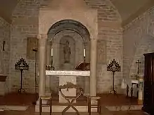 The first building was built between the 7th and 8th centuries on an Etruscan-Roman necropolis and was a female monastic settlement. In 1285 it became a parish church of Porta Eburnea. In 1303 it became dependent on the Cathedral chapter and in 1436 it on the Abbey of Pomposa. In the 16th century, due to the badly damaged roof, it became part of a larger building which is why it appears from the outside as a country house: up to the first half of the 20th century it was used as a farm outbuilding. During the renovation, the orientation of the nave was changed and traces of the temple walls are still visible in the back of the church.[1] During the 17th century, it passed to the seminary and later to the priest of the mission; after that it passed to the Donini family. In 1927, after restoration, it was reopened for worship. Some artefacts of the ancient Etruscan structure are still visible in the perimeter walls, among them a funeral urn with an Etruscan inscription. The ancient wooden truss ceiling, now deteriorated, was replaced in the 16th century with a masonry barrel vault. Inside the church is an ancient 8th-century Lombard marble ciborium with a compendium of early Christian–Ravennate figurative themes mixed with classically derived ones, like peacocks and inverted mirrors. In the presbytery is a statue of Saint Prosper in Arnulfian style, dated from the end of the 13th century.