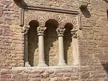 In the rectangular sanctuary atriplet round-arched window (2 by 2 metres (6.6 ft × 6.6 ft) is preserved. With its pre-romanesque bases, rough brick arches, and capitals with rude packed leaves, it gives an idea of the better style of building and carving in the time of Alfonso II of Asturias. It is known that the church of San Tirso housed Royal Chapel.[2]