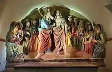 San Vivaldo Monastery is a Roman Catholic convent, church, and sanctuary complex located outside of the town of Montaione, region of Tuscany, Italy. The eighteen distinct chapels on this hill, putatively corresponding to sites of the Holy Land, and containing vivid polychrome statuary groupings recalling events of the New Testament, specially the Passion of Jesus, are one of the few examples of the Sacri Monti complexes in Tuscany. Sacri Monti are more characteristic expressions of veneration in the Piedmont and Lombardy. The convent still houses the franciscan order.