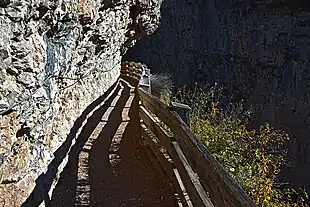 The sanctuary is accessible by car via Sanzeno, or on foot along the sentiero delle forre di San Romedio, an arduous route along a former aqueduct constructed in the mid-19th century for irrigation, recently converted into a very steep footpath over the sheer ravine wall.[5]
