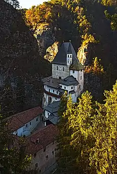 According to legend, Romedius lived in the 4th and 5th centuries, the heir of a rich Bavarian family, son of the Count of Thaur, the lord of a castle near Innsbruck and owner of salt pans in the valley of the River Inn. After a pilgrimage to Rome, he gave all his possessions to the Church, withdrawing into a hermitage in the Val di Non in some grottoes which still exist near the sanctuary. Two companions followed him, Abraham and David. The legend is that one day Romedius, wishing to go to Trento to greet Vigilius, then bishop of that city, asked David to saddle the horse. The disciple returned with the news that the horse had been savaged by a bear, whereupon Romedio ordered him to saddle the bear, which not only allowed this to be done but also let Romedio ride it all the way to Trento. It later lived with him at the hermitage. This episode is commemorated by a wooden statue placed next to a triumphal arch at the entrance to the sanctuary.[2] The existence of the hermit, a member of an aristocratic Bavarian family, can be dated to the first decades of the 11th century, about the same time as the development of his cultus.[3]