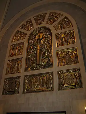 The Royal Chapel also has a Eucharistic relief in gilded bronze in the tabernacle, at the foot of the sepulcher, and a cycle of six sculptural panels on the sides in the form of semicircular apses, representing some moments in the life of St. Paschal. At the entrance to the chapel there are panels with the following scenes: "The young shepherd Paschal receives the Alcantarine sackcloth from St. Francis and St. Clare", "The stoning of St. Paschal in French lands and the triumph of the Eucharist" and "St. Paschal, writer and master of novices". In the frontal apse are the scenes: " St. Paschal exercising charity", "The funeral of the Saint" and "Interview of Father Ximénez with Philip II to promote the canonization of St. Paschal".[5]