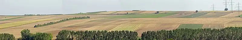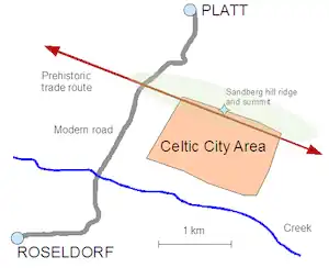 The Sandberg ridge (situated at 48°39′0″N 15°58′0″E / 48.65000°N 15.96667°E / 48.65000; 15.96667) separates the villages of Platt and Roseldorf in the district of Hollabrunn. It consists almost entirely of fertile Löß soil and has been subject to intense agricultural use for centuries. Its summit, although not high, offers a panoramic view far into the surrounding countryside, suggesting strategic considerations might have played a significant role in the selection of the location. While the inhabited area (as far as it has been delineated by surveys) was situated on the southern slope of the hill on the territory of Roseldorf, Platt has much better logistic connections and traditionally harbors the archeologists' base camp.