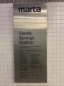 Sandy Springs is an underground metro station in Sandy Springs, Georgia, on the Red Line of the Metropolitan Atlanta Rapid Transit Authority (MARTA) rail system. It serves the Perimeter Center area, including high-rise office parks near GA-400 and Abernathy Road, north of Perimeter Mall. The station lies entirely within the city of Sandy Springs, Georgia which was incorporated in December, 2005, while the station was opened December 16th, 2000. The station includes a pedestrian tunnel under Abernathy Road providing direct access to North Park and WestRock business parks. The parking deck is expandable to seven stories, though only six have been completed.[2] The station also features knockout panels built into the concourse level to allow for privately built underground entrances to future developments.[2] The station also features colored paneling, with red colored artwork on the northbound platform, and green colored artwork on the southbound platform, making it easier for customers to distinguish what platform they are on.[2]