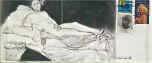 Khewhok is best known for his miniature portraits, some painted on pills and wooden ice cream spoons.[4] His Edouard Manet from 1999 is a subtractive drawing in graphite on a used envelope. One of the three stamps is also drawn in graphite. He has exhibited miniature sculptures, including mixed media life-sized sculptures of insects. The Hawaii State Art Museum[5][6] and the Honolulu Museum of Art[7][8] are among the public collections holding works by Khewhok.