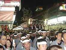 Sanja Matsuri (三社祭, literally "Three Shrine Festival"), or Sanja Festival, is one of the three largest Shinto festivals in Tokyo. It is considered one of the wildest and largest in Japan.[2] The festival is held in honor of Hinokuma Hamanari, Hinokuma Takenari, and Hajino Nakatomo, the three men who established and founded the Sensō-ji Buddhist temple. Sanja Matsuri is held on the third weekend of every May at Asakusa Shrine.[3] Its prominent parades revolve around three mikoshi (portable shrines referenced in the festival's name), as well as traditional music and dancing. Over the course of three days, the festival attracts 1.5 to 2 million locals and tourists every year.[4]