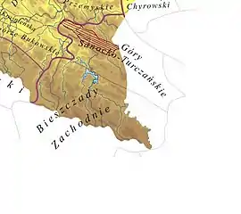 The Sanok-Turka mountain range stretches on an area of 930 km² to the north of the Bieszczady Mountains, and to the south of the Przemyskie Upland, between the valleys of the middle San and Stryi River. They extend after the river Stryi by the Beskidy Brzeżne. The northern boundary is made by the rivers Wiar, Łomna, Stupnica, Leszczawka, Lachawka and Tyrawski, the western valley of the river San.[1] Sometimes the territories to the East and South of the river Wiar, (like the Sucha Obycz Massif), and the east of the Lachawka river valley to the valley of the river San (Wysokiego mountain range) are added to Sanocko-Turczańskie mountains (there are also different variations of the northern border). The southern border is generally carried through the ridges of the Otryt mountain range and through the San where the Tyrawski river joins as a tributary, although sometimes the Otryt mountain range is linked with the Sanocko-Turczańskie mountains, then the southern border is the Upper San river.[2]