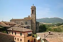 The church of Sant'Agostino was built in the 13th century on the steep hillside on the outskirts of the medieval town. The Romanesque-style rounded arch stone entrance portal, decorated with floral and vegetative motifs, is the only part of the original church that remains. The portal now perilously leans toward the street. The remainder of the church was rebuilt in the 18th century with a dome, and interiors decorated with stucco in baroque style. The church contains three late 16th-century works attributed to Ercole Ramazzani: Noli me Tangere; St Nicola di Tolentino intercedes for Souls in Purgatory; and a Madonna, Child and Saints. A painting depicting the St Francis in Extasis receives the stigmata is attributed to the studio of Guercino. [1]