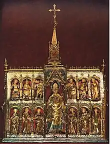 Arqueta de Sant Martirià (Casket of Saint Martirià) is considered one of the most prominent goldsmithing elements of Girona. It is 15th-century Gothic and contains the remains of Sant Martirià, patron of the city. The cypress wood box is coated with silver and shaped as a Gothic church, surrounded by seven figures which are also silver-coated.
