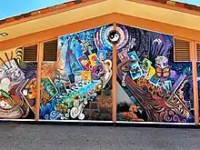 In collaboration with SBHS alumni, including local artist Manuel Unzueta, more than 20 students at Santa Barbara High School painted a 60-foot ethnic mural outside the campus cafeteria. The six-panel mural, titled ‘La Loteria De Vida" (The Life Lottery) features symbols of Chicano and Chumash culture, while paying tribute to history of Santa Barbara and the high school. Hundreds of people turned out for the mural's official unveiling in 2021.[23]