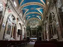 Over the last centuries, the restorations removed earlier frescoes, but the altars and nave have Baroque style. The lateral altars have 18th-century altarpieces and statues of Saints John the Baptist and Antony. Above the entrance was the cloistered cantory used by the cloistered nuns to attend service. The "Via Crucis" were painted by Lin Deija, for whom is named a museum of sacred art is located in the former convent.[1]