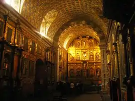 Together with the choir and main arch, it represents the most splendid focus of the church. Built around the middle of the 17th century, it consists of three bodies and five streets, carved and gilded entirely in gold leaf, paid for entirely by Doña María Arias de Ugarte, according to historical documents it cost her the value of 4,200 pesos of a 8 shields. The niches exhibit figures carved in wood, several with costumes made of glued fabric and richly decorated with the techniques of stew and sgraffito.