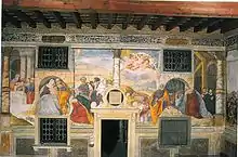 Adjacent to the basilica is a 15th-century cloister and a small prayer hall of the confraternity of the Carmine, known as the Scuola or Scuoletta del Carmine. It has splendid 16th century frescoes, including: