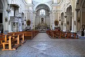 The main altar and holy water fonts are from the studio of Fanzago. In the first chapel on the left is a 16th-century canvas depicting the Madonna of the Rosary with the Universal Judgement by Michele Cuira. The other chapels include paintings such as a Deposition by the school of Giovanni Bernardo Lama; a triptych with the Annunciation and Saint Andrew and Veronica by the school of Andrea Sabbatini.A depiction of the Virgin Mary with Pius V and Philip II can be seen at Santa Maria della Mercede a Montecalvario.[3] Other works in the church are by Leonardo Castellani, by Giacomo da Cosenza, and followers of Beinaschi.
