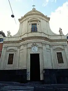 The church was built from 1775 to 1789 using designs from Antonino Battaglia, the son of Francesco Battaglia. The convex facade recalls the baroque churches designed by Francesco, but it maintains a more classical sobriety of neoclassicism with corinthian pilasters, and less extraneous decoration. Above the portal is a Virgin under a clam-shell with a banner extolling purity.