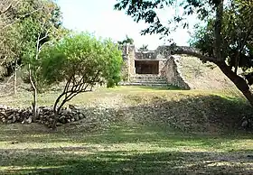 Little structural evidence remains from the Postclassic era. The only existing structure at the ruins dates from the Classic era.[2] The centre of this building has been described as a ceremonial chamber, with a complex series of interconnected passages leading to other rooms, including two burial chambers. One contained the remains an elderly woman surrounded with jewellery and pottery; the other was that of a warlord, evident from the artefacts found buried with him — a ceremonial flint representing leadership and a stingray spine most used in blood-letting rituals.[1][2] Both burials date from around 500 CE.[1]