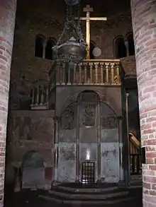 Also called the Church of the Holy Cross or of Calvary or Trinity. Originally it had to be built in the form of a basilica with 5 naves, with an apse in front of the holy garden (Pilato's courtyard) and the façade to the east, exactly as it was originally the Holy Sepulcher in Jerusalem wanted by Constantino. Probably due to lack of funds, Petronius could not complete the building that remained unfinished. Later, with the advent of the Lombards, it would become a Baptistery. At the beginning of a thousand, during the reconstructions made by the Benedictines, there were several uncertainties about how to finish the work, considering that the original Holy Sepulcher had been heavily altered and in those years the Fatimite Caliph al-Hakim was working its destruction . So having lost the historical references of what it was originally, the Benedictines could not complete it. After the late nineteenth-century renovations, currently it is divided into 5 naves, with the façade facing the courtyard and the apse facing east, both built in neo-Romanesque style on the model of the Holy Sepulcher built by the Crusaders. From the time of the Crusades and until 1950, a relic of the Holy Cross was kept in the central chapel.