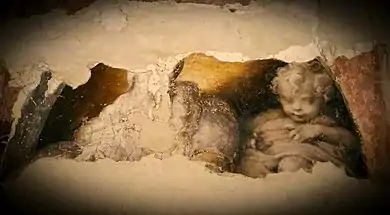 It was discovered during restoration work and first published in 1978. Its composition matches that in a print by Francesco Rosaspina and several painted copies, one in Antonio Pirri's collection in Rome and another oil on canvas work from the Farnese Collection now in the Museo di Capodimonte in Naples.[4] The original fresco is held to have been commissioned by the palazzo's then owner Galeazzo Sanvitale, though in 1998 Frlotti theorised it may have been painted for someone else and that the "Palazzetto Eucherio Sanvitale" then corresponded to the original nucleus of the Palazzo del Giardino rather than to the building now known as the Palazzetto Eucherio Sanvitale.[5]