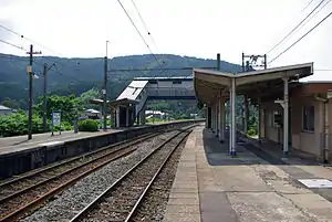 The station has one side platform and one island platform connected to the station building by a footbridge. The station is unattended.