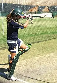 England won all the ODI matches except the last, which was washed out.[2] Andrews played in the one-off Test at County Road in Worcestershire. Batting at No. 11, she scored 11 from 14 balls in Australia's 309, before taking 1/32 from an economical display of 20.3 overs to help Australia take a 41-run lead. Having caught Lydia Greenway early in the innings, she then bowled the final English batsman Laura Marsh for 38, ending a last-wicket partnership of 59.[10] She then made 4 not out as Australia were bowled out for 231 to set the hosts a target of 273 before the match was drawn.[2] She took 1/22—dismissing opener Caroline Atkins for a duck—from 13 overs in the second innings, meaning that she had conceded less than two runs per over throughout the match.[2][10]