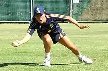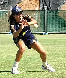 Andrews was rewarded with selection for Australia for the home series against India held in Adelaide at the end of the season. She made her debut in the one-off Test at the Adelaide Oval, and came in at No. 11 after Australia batted first. she made three from six balls before being run out as the hosts made 250.[4] Opening the bowling with Cathryn Fitzpatrick, she took 2/29 from nine overs in the first innings. She had opener Monica Sumra caught by Karen Rolton in her second over, and then trapped the other opener Karu Jain for 21 to leave the Indians at 2/41. In the following over, without further addition to the score, Andrews took her maiden Test catch to dismiss leading Indian batsman and captain Mithali Raj from the bowling of Fitzpatrick. The Indians eventually collapsed to be all out for 93. Australia enforced the follow on and Andrews took 0/19 from 17 overs and caught Sunetra Paranjpe in the second innings as the tourists lost by an innings.[2][4] After missing the first ODI, she made her debut in the second match, coming in at No. 11 and scoring four not out from seven balls in Australia's 173 all out.[2][5] She then took 3/21 from six overs to help secure a 12-run win. In the next match she took 1/33 in a nine-wicket win and ended the series with four wickets at 13.50 and an economy rate of 3.33.[2] Andrews is the 148th woman to play Test cricket for Australia,[6] and the 106th woman to play One Day International cricket for Australia.[6][7]