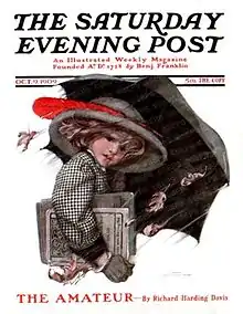 In 1904, The Saturday Evening Post began hiring women to illustrate the covers of their magazine.[2] Weber illustrated 60[2] of the magazine's covers starting with New Year’s Number, 1904 on December 31, 1904, and ending with Swinging in the Apple Tree on the August 15, 1925, issue.[6] Although she had been offered the ability to contract for scheduled covers, Weber preferred to complete her works to her satisfaction, rather than being constrained by deadlines.[2] She created illustrations of young children, capturing their enthusiastic and delighted faces while playing. The Saturday Evening Post stated that she was "particularly adept at creating movement and flow that gave the impression of coming and going... [and] that the subject would dance off the page in the next moment."[2] The images of young girls were often depicted like little women, engaged in charming scenes, like flying kites, watering roses, or cuddling cats.[7] Weber was one of several talented illustrators—like J. C. Leyendecker, Neysa McMein, Anita Parkhurst, C. Coles Phillips and Cushman Parker—created illustrations of the weekly magazine, which in the early 20th century was limited to a two-color printing process.[8]
