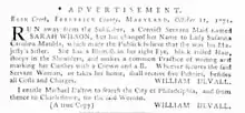 According to an advertisement dated October 11, 1771, reprinted in Rivington’s New York Gazetteer for May 13, 1773, Wilson was sold to William Devall, or Duvall, of Bush-Creek, Frederick County, Maryland as a convict servant maid, and had escaped from him.