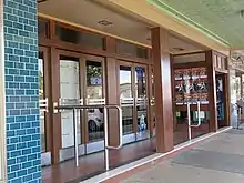 The pavement front to the theatre is original to the 1940 rehabilitation with the exception of the double doors or glazed panels at the northern end (in front of the candy bar or former "cafe"). The four sets of 1940 vintage double doors are handsome with their varnished timber finish and heavy triple horizontal, chrome push bars. Above the doors, for their full length, is one of the largest seen (for a single screen cinema) rear-illuminated opalescent program sign to take removable letters (for the films currently being shown).[20] It is also a typical element of the late 1930s, but has continued through until today.[1]