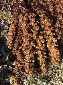 Sargassum polyphyllum, or limu kala, consists of thin, rough, wavy blades and a firm thallus.[2] Its height can range anywhere from 4 to 70 centimeters.[3] Sargassum polyphyllum is versatile and resilient enough to survive in areas such as harsh intertidal zones.[3]