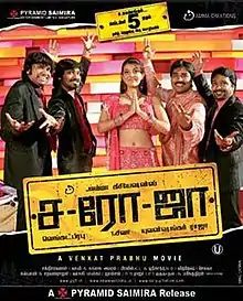 Saroja (stylised as Sa-Ro-Ja) is a 2008 Indian Tamil-language comedy thriller film written and directed by Venkat Prabhu and produced by T. Siva. It stars Shiva, Vaibhav, Premji, S. P. Charan and Vega Tamotia as the title character, while Jayaram, Prakash Raj, Sampath Raj, Nikita Thukral, Bose Venkat and Kajal Aggarwal play other vital roles. Several other popular Tamil television artists and crew members make special appearances throughout the film. The score and soundtrack were composed by Yuvan Shankar Raja with cinematography by Sakthi Saravanan.