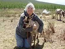 Carey also continued her work in the Gobi by founding the non-profit NGO Nomadicare, which supported the sustainability and cultural survival of nomadic peoples in Mongolia by harmonizing traditional and modern medicine and documenting nomadic ways. She has traveled in rural Mongolia nearly every year since 2000.[8] In 2003, Carey extended Nomadicare's work to include the Dukha reindeer herders of the Mongolian Taiga. One traveler in the Taiga described Carey: "in her mid-60s and a reluctant horsewoman, but she has spent the past seven summers riding round the 44 nomadic families in East Taiga to collect data".[9] For a decade Nomadicare provided traditional Mongolian medicine training, laboratory supplies and general training to rural Gobi and northern Mongolia's rural health centers' health professionals.[10][11][12] It also helped American and Mongolian life sciences students to study with nomadic peoples[13][14] Jane Goodall, PhD, said "I fully support the work of [Sas Carey’s] Nomadicare as it seeks to preserve Mongolia’s nomads through health care."[7] Today, Nomadicare is focused on preserving the traditional culture of Mongolia through films and stories.