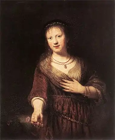 Saskia with a Flower is a 1641 oil on canvas portrait by Rembrandt of his wife Saskia van Uylenburgh, now in the Gemäldegalerie Alte Meister in Dresden.[1] It is also known as Saskia with a Red Flower, Saskia with a Carnation or Saskia as Flora.