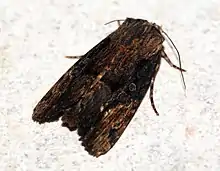 Its wingspan is about 36–42 mm. Body dark and reddish brown or black and grey. Forewings with slight streaks in the interspaces. The transverse lines are almost obsolete. Orbicular small, circular, and usually prominent, whereas reniform almost obsolete. There is a dark patch on costa before apex. Apical and basal inner area and angle often greyish or reddish brown. Hindwings fuscous brown.[2]