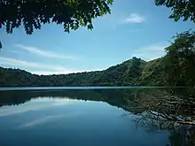 There is a lake in the middle of the island, which has an area of 77 hectares, occupying two nested craters 39 and 69 meter deep as determined by echosounding.[6] Research by two European scientists named Stephan Kempe and Josef Kazmierczak during 1984, 1989, 1993 and 1996[7] found the water of Satonda Lake as salty with alkaline levels much higher than regular sea water. This causes a high supersaturation of calcium carbonate minerals and the formation of microbialitic stromatolites along the fringes of the lake.[8] They jointly concluded that Satonda basin was formed of craters aged more than ten thousand years.