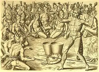 ![]() One of Theodor de Bry's engravings, supposedly based on drawings by Jacques LeMoyne, depicting Chief Saturiwa preparing his men for battle | |