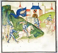 Depiction in the Berner Chronik, showing the Saubanner outside of the gates of Berne.