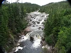 The river is known for the dramatic evidence of glacial action, which has created large ridges and grooves in the bedrock. A section of the river cascading over these flutes is visible from Quebec Route 138.
