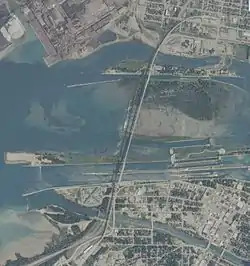 ![]() The Railroad Bridge runs parallel to the highway bridge, and is the bridge on the left in the image. | |