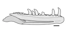 Aase Roland Jacobsen published a description of a Saurornitholestes dentary in 2001.[21] The dentary is about 12 cm long and preserves fifteen tooth positions, of which only ten preserve teeth.[22] Three toothmarks were visible on the inner "lingual" surface of the dentary.[22] Two of the three marks are series of grooves made by the serrations on the maker's teeth.[22] The striations are between 0.37 mm and 0.40 mm thick with cuboidal cross-sections.[23]