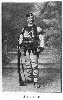 In 1905 he fled to the Kingdom of Serbia and entered into the 2nd Infantry Regiment "Knjaz Mihailo" in Niš.[3] After a year, he also entered and finished the Military Academy in Belgrade, after which he served as a sergeant (vodnik) in the 12th Infantry Regiment "Tsar Lazar" in Kruševac.[3] In 1906 he joined the Serbian Chetnik Organization and fought in the Poreče region, after which he was appointed Chief of Upper Staff at the beginning of 1907.[3] His nom de guerre was Grmija.[1]