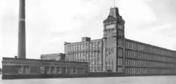 Saxon mill was built in 1906, for the Saxon Mill Co. Ltd, a company formed by the Ashton Syndicate who were responsible for Minerva Mill, Ashton-under-Lyne etc. In 1908 it had 80,000 spindles which rose to 82,000 in 1920, when it was recapitalised.[4] The industry had peaked in 1912 when it produced 8 billion yards of cloth. The Great War of 1914–18 had halted the supply of raw cotton, and the British government encouraged its colonies to build mills to spin and weave cotton. The war over, Lancashire never regained its markets. The independent mills were struggling. The Bank of England set up the Lancashire Cotton Corporation in 1929 to attempt to rationalise and save the industry.[5] Saxon Mill, Droylsden was one of 104 mills bought by the LCC, and one of the 53 mills that survived through to 1950. It was switched to rayon production. In 1953 it employed 250 people.[4] It was the last mill in the country to produce cop weft.[6] Saxon Mill was closed by Courtaulds in 1967.[7]