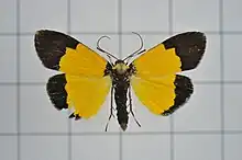 Its wingspan is 30 mm. The species differs from Scaptesyle tricolor, in being deep black and bright golden yellow. Forewings with the broader outer margin and wholly black. Hindwings with much broader marginal black area and reaching anal angle. In Indian specimens, marginal black band is much narrower than Sri Lankan specimen.[3]