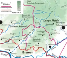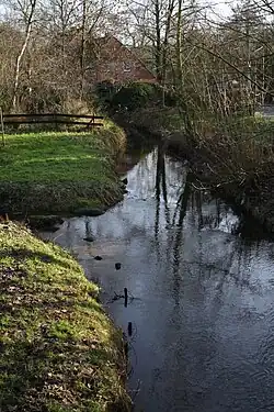 The Schönebecker Aue's total length is 17.7 km (11.0 mi), of which the last 3.1 km (1.9 mi) are in the city of Bremen.[2] The stream's source is on the Lange Heide, a geest plateau north of Bremen in Osterholz-Scharmbeck, which is also the source of several other geest streams (e.g.: the Drepte, Giehler Bach, Scharmbecker Bach and Wienbeck).