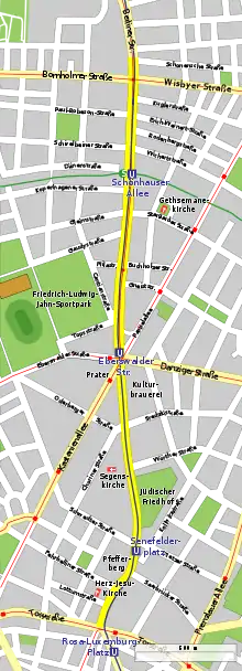 The Berlin U-Bahn line U2 follows the boulevard on an elevated railway.