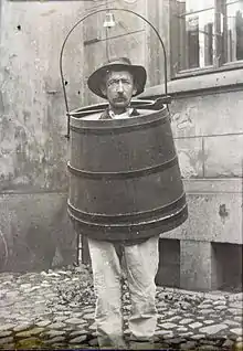 A Schandmantel or Schandtonne (German, "coat of shame" or "barrel of shame"), sometimes also Spanish coat, is a torture device which came into use in the 13th century. Schandmantels were fashioned from wood and sometimes lined with sheet metal. Victims were made to wear this device in public where they would be insulted, humiliated and have rotten vegetables thrown at them. The Schandmantel was mostly used as punishment for poachers and prostitutes.